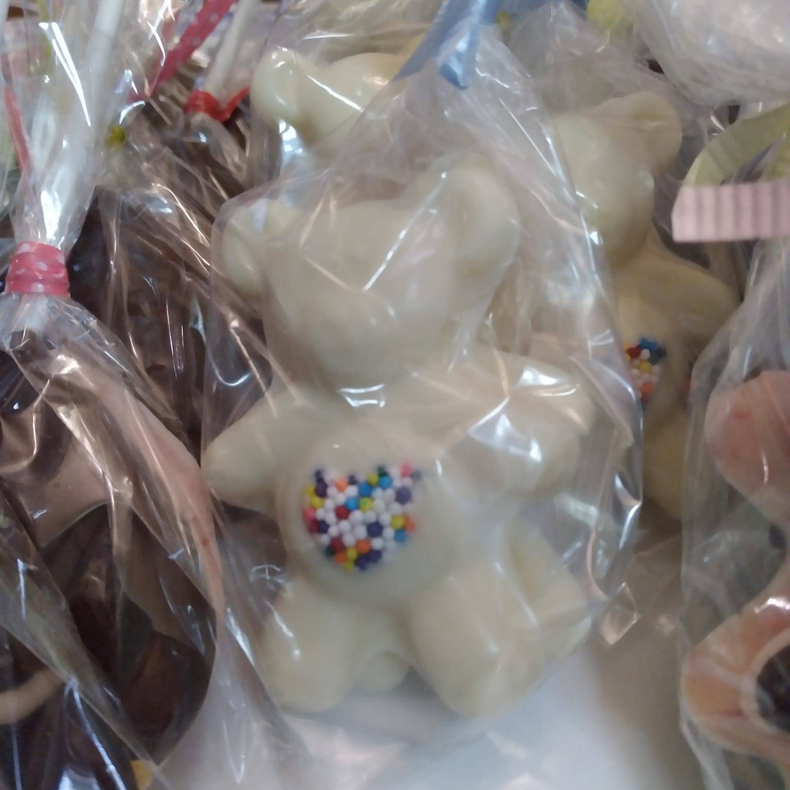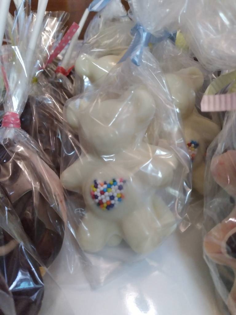 All chocolates are made with CANDYQUIK™, extracts, and/or food coloring. I, personally melt, mix, mold, and wrap each chocolate in-house.